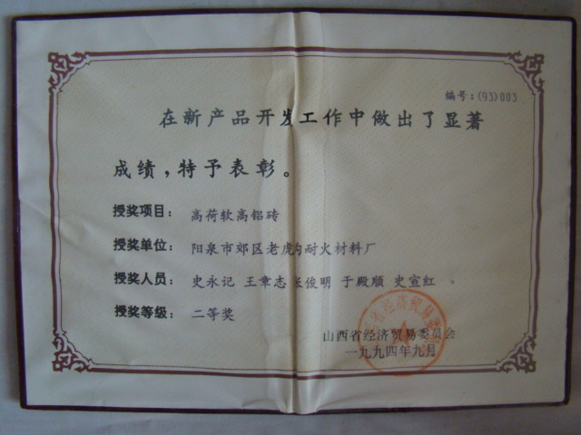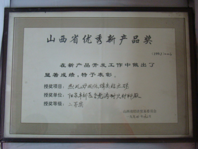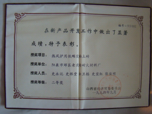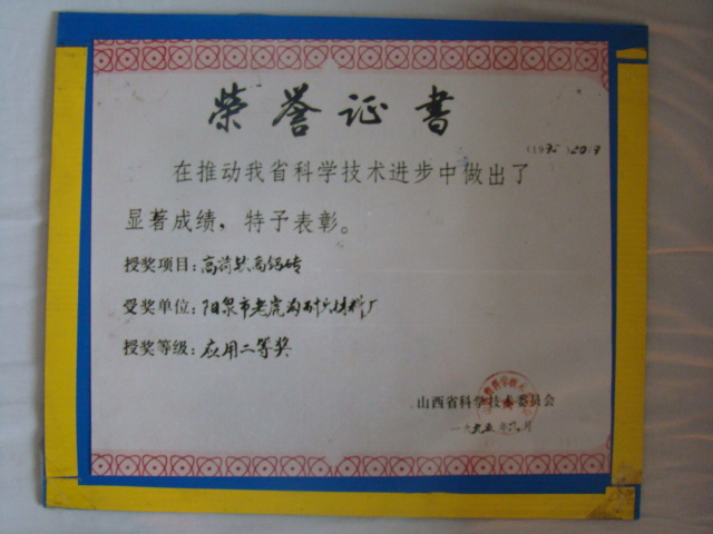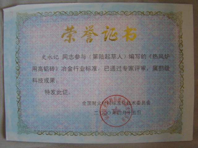 熱風(fēng)爐用低蠕變高鋁磚、高荷軟高鋁磚獲省科技進(jìn)步二等獎,微膨脹高鋁磚列入火炬計劃項目,炭素焙燒爐用特種高鋁磚已批準(zhǔn)國家專利